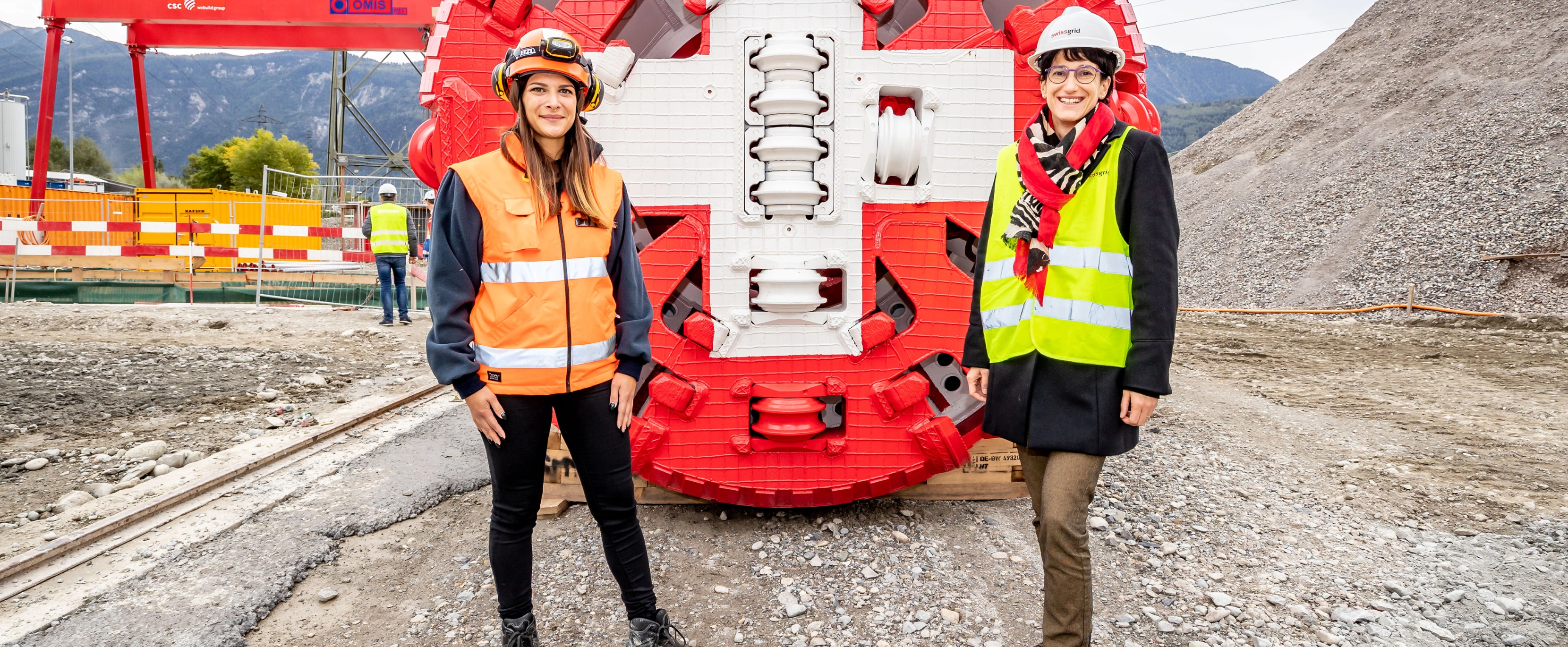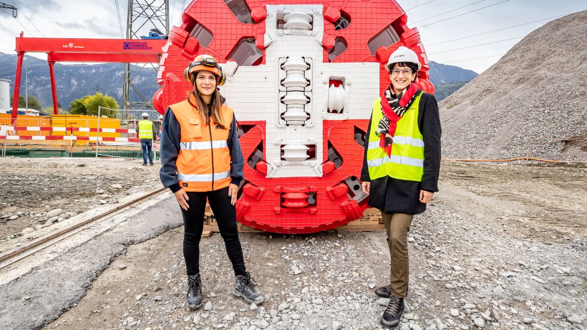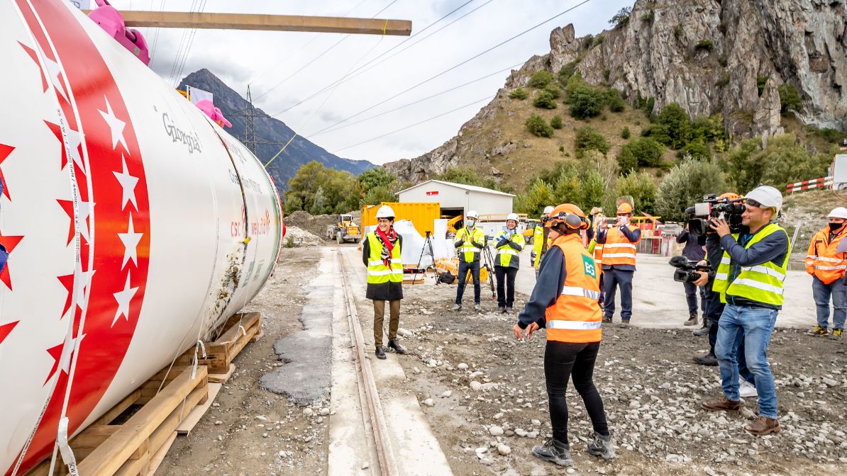Die Mini-Tunnelbohrmaschine in den Farben des Wallis und der Schweiz erhält am Freitag, dem 2. Oktober 2020 auf der Baustelle in Le Verney in Anwesenheit von Anne-Laure Couchepin Vouilloz, Stadtpräsidentin von Martigny, traditionellerweise einen weiblichen Vornamen. Die rund 60 Tonnen schwere Maschine hört in Zukunft auf den schönen Namen Giorgia und wird kurz nach ihrer Taufe in den Schacht in Le Verney herabgelassen.